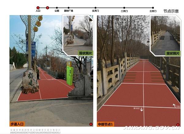 項目實施地點為安康市香溪洞風(fēng)景區(qū)原有健身步道(水泥路面),北起香溪文化廣場南側(cè),南至香溪洞景區(qū)停車場,全長約1.5公里,寬度介于2.47—3.72米之間。