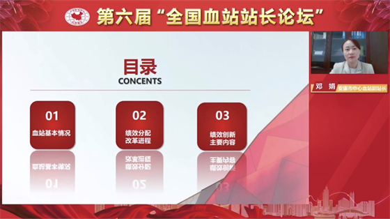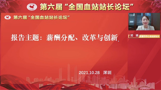 為加強(qiáng)全國血站的經(jīng)驗(yàn)交流與合作,2021年10月27日至28日,第六屆 “全國血站站長(zhǎng)論壇”在深圳市舉辦。中國輸血協(xié)會(huì)理事長(zhǎng)、世界衛(wèi)生組織輸血合作中心主任朱永明,深圳市衛(wèi)健委二級(jí)巡視員林漢城等相關(guān)領(lǐng)導(dǎo)出席并致辭。此次論壇的主題是“血站建設(shè)與發(fā)展、改革與創(chuàng)新”,來自全國各省、市血液中心(血站)的同仁通過線上方式參加會(huì)議。安康市中心血站副站長(zhǎng)鄧娟作為全國血站六個(gè)優(yōu)秀論文交流發(fā)言人之一,就安康血站績(jī)效分配、改革與創(chuàng)新工作在會(huì)上進(jìn)行了經(jīng)驗(yàn)交流。