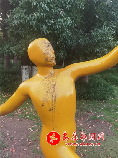 五一期間,安康高新區(qū)運(yùn)動公園內(nèi),一處運(yùn)動塑像遭人“抹黑”,污跡斑斑,有礙觀瞻。(記者 許安)?