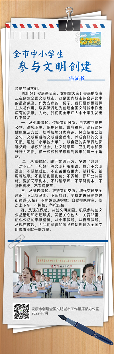 你們好!安康是我家,文明靠大家!美麗的安康正在創(chuàng)建全國文明城市,這是國內(nèi)城市綜合評比中的最高榮譽。作為安康的一份子,我們要積極發(fā)揮主人翁作用,以實際行動為創(chuàng)建全國文明城市作出應(yīng)有的貢獻(xiàn)。為此,我們向全市廣大中小學(xué)生發(fā)出以下倡議: