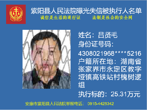 曝光失信 | 紫陽縣人民法院:關(guān)于敦促呂賢毛履行法定義務的公告