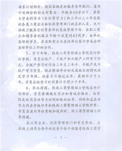 按照省政府有關(guān)文件規(guī)定,學(xué)員修滿規(guī)定的課程學(xué)分,完成畢業(yè)論文,通過(guò)論文答辯及評(píng)審后,由陜西工商管理碩士學(xué)院頒發(fā)畢業(yè)證書和學(xué)力證明。學(xué)員在省內(nèi)單位晉級(jí)和使用時(shí),視同工商管理碩士。