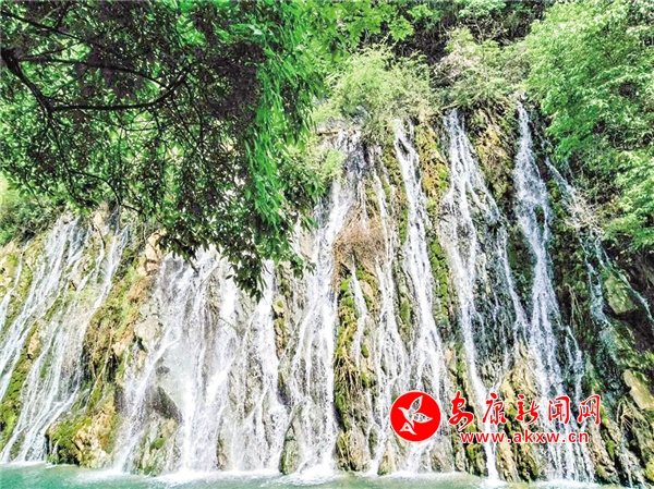 沿著木質(zhì)棧道前行,沒(méi)走多遠(yuǎn),耳中就傳來(lái)轟隆隆的水鳴聲,循聲望去,原來(lái)在大峽谷東南面的半山腰上有一掛巨大的瀑布。透過(guò)枝葉縫隙遙看瀑布的源頭,只見(jiàn)清清的泉水翻過(guò)一條石堰,從高高的崖壁口義無(wú)反顧地縱身飛躍而下,本是渾然一體的百米巨幅水簾,被凹凸不平的壁巖、樹(shù)枝、水草撕裂成形狀不一的一縷縷絹綢,千絲萬(wàn)縷地交織著,撕扯著。細(xì)看,又猶如由萬(wàn)千珍珠串起的珠簾,懸于半山腰間。瀑布四周彌漫著流云般的淡淡煙霞,初夏的陽(yáng)光照耀著瀑布,折射出炫目的七彩光芒,形成一道道彩虹。粒粒珍珠流光溢彩、熠熠生輝。壁巖上嶙峋的怪石被水經(jīng)年累月地沖刷,早已失去了棱角,變得圓滑溫潤(rùn)。因?yàn)槌睗竦木売桑瑤r壁上鋪了一層厚厚的、碧綠的青苔,讓瀑布有了層次感,像極了妙手丹青繪制的巨幅山水壁畫(huà),鮮活靈動(dòng)。游人紛紛拿出手機(jī),在此排隊(duì)拍照、攝影留念。因它位于峽谷門(mén)口,似是迎接各位游客,故得名“迎賓瀑”。想到前幾日,朋友圈有人曬出聞名古今的廬山瀑布,只剩下一縷細(xì)細(xì)的溪流,從上面無(wú)力地流瀉下來(lái),似是隨時(shí)都有中斷的可能,哪里還有“飛流直下三千尺,疑是銀河落九天”的氣勢(shì)時(shí),不由得對(duì)眼前的這掛瀑布更加喜愛(ài)。