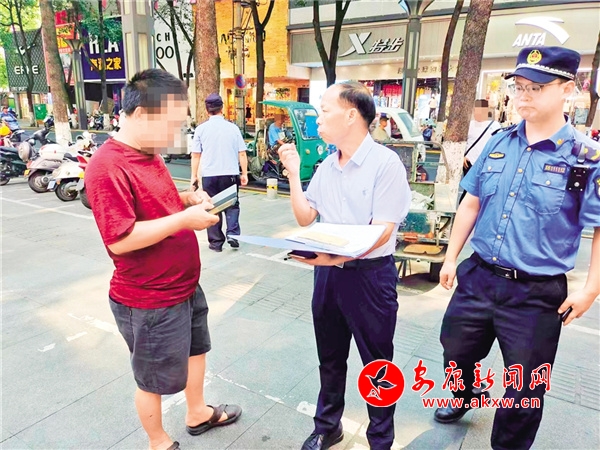 7月18日上午,漢濱城管執(zhí)法分局“‘痰’吐文雅,舉‘紙’得體”糾治組在金州路、白天鵝廣場以及公交車站附近巡查值守,對取證發(fā)現(xiàn)的隨地吐痰不文明行為進(jìn)行法規(guī)宣傳教育,并采取罰款、微信朋友圈發(fā)公益廣告集贊等形式給予糾治。李東 攝