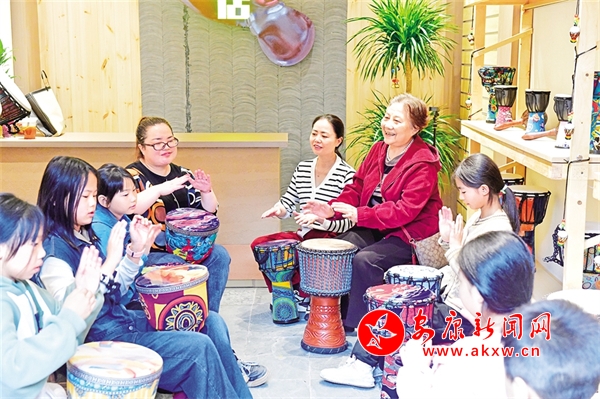 國(guó)慶期間,漢陰雙河口古鎮(zhèn)游客爆滿(mǎn)。圖為游客在古鎮(zhèn)手鼓店體驗(yàn)打手鼓。陳浩 攝