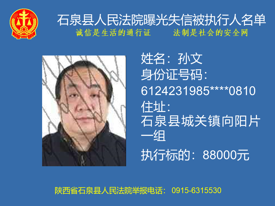 為了進(jìn)一步加大執(zhí)行力度,保障勝訴當(dāng)事人的合法權(quán)益,推進(jìn)社會(huì)誠(chéng)信體系建設(shè),依照《中華人民共和國(guó)民事訴訟法》、《最高人民法院關(guān)于公布失信被執(zhí)行人名單信息的若干規(guī)定》等法律、司法解釋的有關(guān)規(guī)定,現(xiàn)對(duì)一批已進(jìn)入執(zhí)行程序,且尚未全部履行義務(wù)的被執(zhí)行人進(jìn)行媒體曝光,歡迎廣大群眾支持石泉縣人民法院的工作,向我院提供被執(zhí)行人的財(cái)產(chǎn)線索,使生效法律文書(shū)能夠得到切實(shí)執(zhí)行,讓人民群眾切實(shí)感受到公平正義就在身邊。
