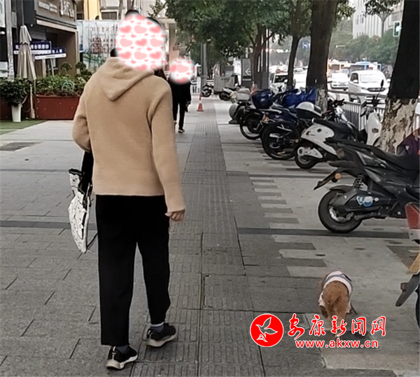 11月9日上午,大橋路鑫街口人行道上有市民遛狗不牽繩。(圖文/周薇)