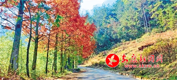 車(chē)子沿著山路繼續(xù)往上,途中時(shí)不時(shí)掠過(guò)一排排水杉,水杉的顏色有綠有黃、有深有淺,高大挺拔、直入云端。偶爾有幾棵同類(lèi)型品種夾雜其中,已全然呈現(xiàn)出上下一體的棕黃色。在太陽(yáng)的照射下,仿佛是身披金黃鎧甲的戰(zhàn)士,堅(jiān)韌有力。枝葉在微風(fēng)中輕搖,沙沙地響,視聽(tīng)一體的感覺(jué),不覺(jué)教人沉醉其中。