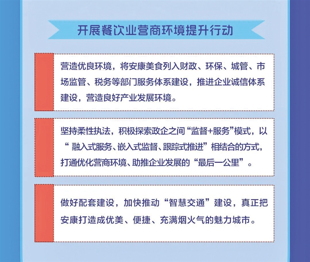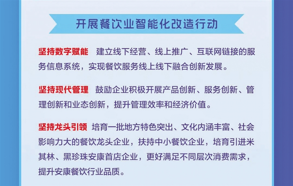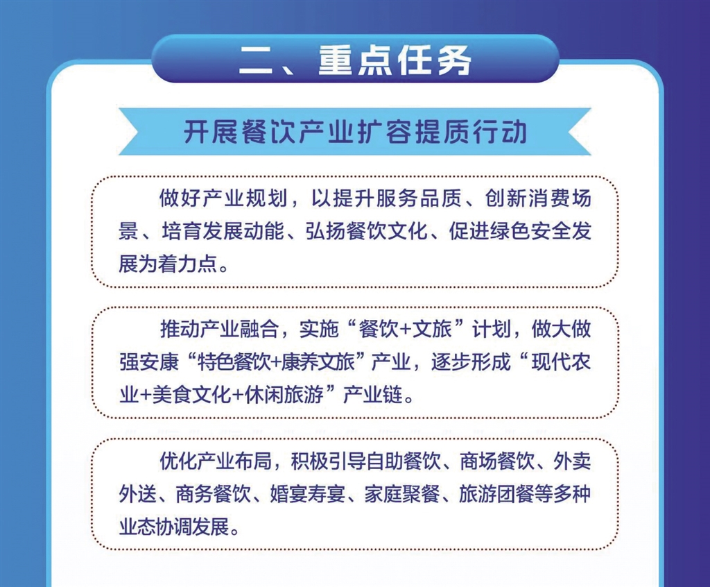 日前,安康市商務(wù)局等11部門聯(lián)合發(fā)布《關(guān)于進(jìn)一步推進(jìn)全市餐飲業(yè)高質(zhì)量發(fā)展的實(shí)施意見》,本期帶您一圖讀懂其重點(diǎn)任務(wù)。