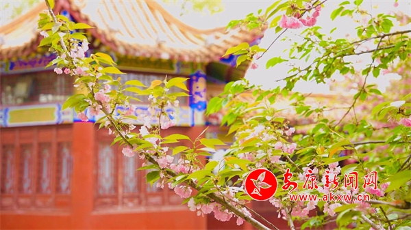 在龍崗閣兩側(cè),淺白和粉紅的櫻花一團(tuán)團(tuán)、一簇簇在藍(lán)天白云的映襯下,在枝頭舞蹈,伴隨著微風(fēng),陣陣花香四溢,沁人心脾。置身其間,繁花耀眼,香飄四溢,唯美景色引人入勝。