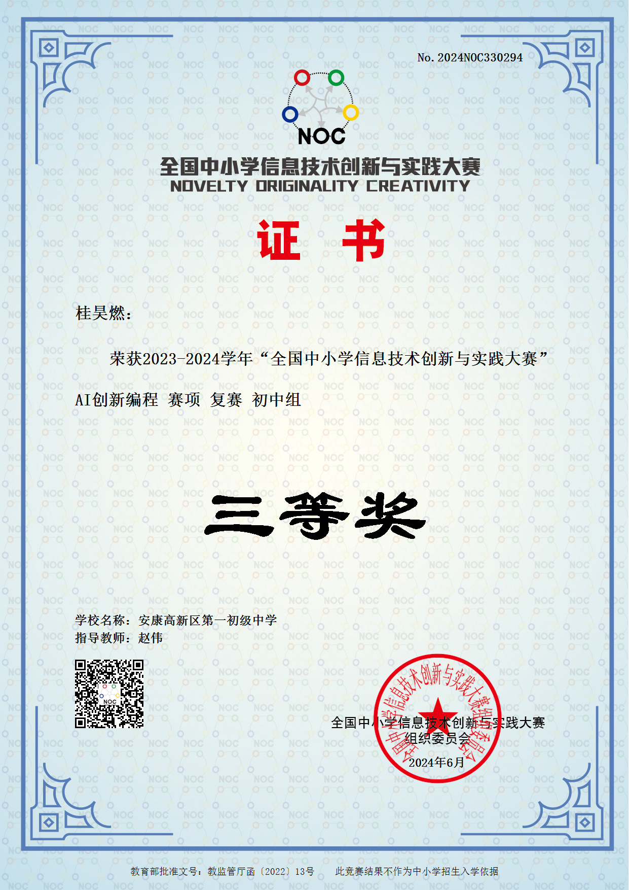 本網(wǎng)訊(通訊員 趙偉)近日,高新區(qū)第一初級中學(xué)桂昊燃同學(xué)在全國中小學(xué)信息技術(shù)創(chuàng)新與實(shí)踐大賽復(fù)賽中榮獲三等獎(jiǎng),該生由趙偉老師指導(dǎo)。