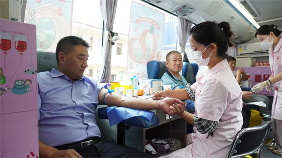 活動現(xiàn)場,無償獻血志愿者在醫(yī)務(wù)人員的引導(dǎo)下有序進行登記、體檢、測血壓。紅色的血液從血管中抽出,緩緩流進輸血袋,一袋袋鮮紅的血液和一張張光榮的獻血證,傳遞著愛心和希望。
