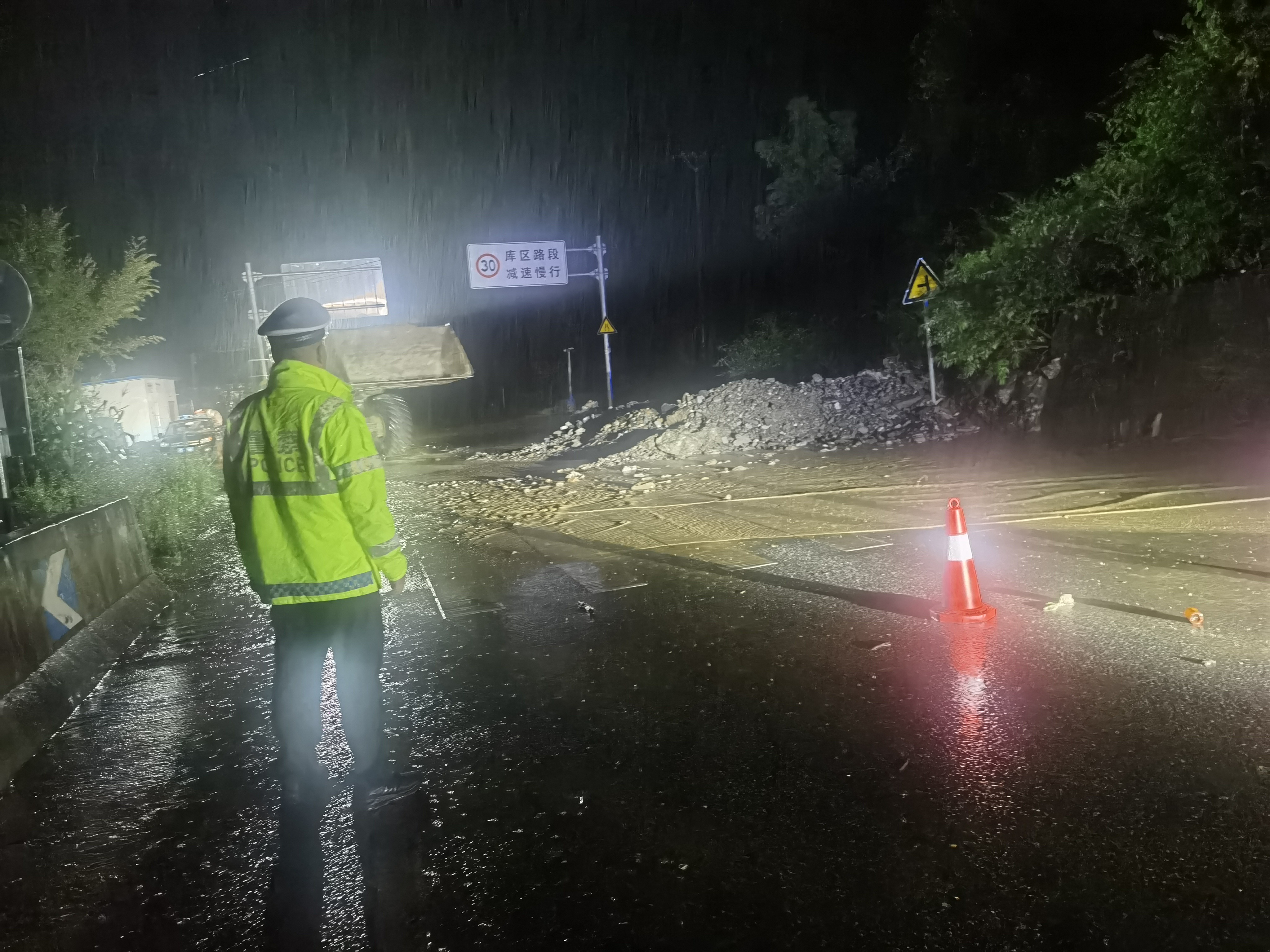 旬陽市公安交警持續(xù)堅守防汛一線,無畏風(fēng)雨、無懼危險,開展交通管控、救援救助、應(yīng)急處突、隱患排除等相關(guān)工作,全力保障人民群眾生命財產(chǎn)安全。暴雨中,交警身著熒光綠雨衣,不畏風(fēng)雨,堅守在重要路段,對有滑坡、落石等危險路段及具有安全風(fēng)險的臨水臨崖路段,采取臨時禁行的管制措施,引導(dǎo)過往車輛繞行,注意行車安全,協(xié)同相關(guān)部門現(xiàn)場進(jìn)行清理,對不能現(xiàn)場處理的隱患及時上報,確保排險不留盲點(diǎn)、隱患不留死角。同時加強(qiáng)道路的巡邏管控,通過遠(yuǎn)端分流,引導(dǎo)車輛、行人安全有序通行,確保群眾出行安全。以雨為令,以夜為伴,逆風(fēng)而行,通宵達(dá)旦,風(fēng)雨中,一抹抹“熒光綠”在熠熠閃光。