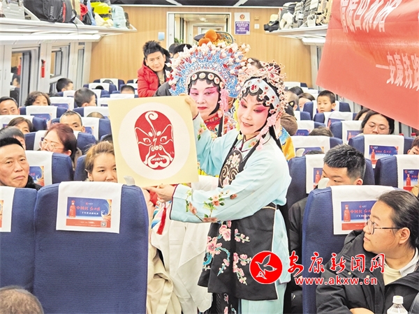 火車穿越秦巴山水間,途中,來(lái)自安康漢調(diào)二黃研究院的專業(yè)演員和地方民間漢調(diào)二黃愛好者們一同表演了國(guó)家級(jí)非物質(zhì)文化遺產(chǎn)——漢調(diào)二黃經(jīng)典戲曲演唱,并為旅客們講解漢調(diào)二黃戲曲知識(shí),與旅客們開展互動(dòng)交流,讓旅客親身體驗(yàn)漢調(diào)二黃戲服道具,感受漢調(diào)二黃的獨(dú)特藝術(shù)魅力。來(lái)自漢濱區(qū)文化館的漢濱剪紙技藝傳承人為旅客們展示講解了安康市級(jí)非物質(zhì)文化遺產(chǎn)——漢濱剪紙技藝,向參與互動(dòng)的旅客送上了親手創(chuàng)作的漢濱剪紙作品,提前送上新春祝福?;顒?dòng)中,西安鐵路公安局安康公安處的民警們和文藝工作者們一同宣傳普及了反詐知識(shí),進(jìn)一步提升旅客的安全防范意識(shí)。