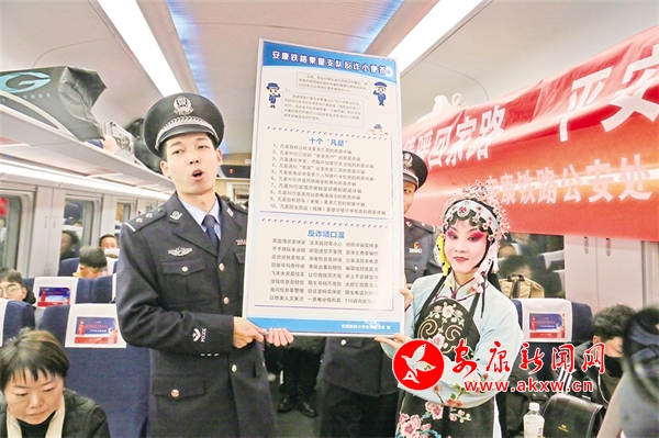 1月14日,由西安開往達(dá)州的D173次列車上,西安鐵路公安局安康公安處聯(lián)合漢濱區(qū)文化館、安康漢調(diào)二黃研究院的文藝工作者,以地方非物質(zhì)文化遺產(chǎn)技藝展示等方式,結(jié)合春運(yùn)開展反詐知識(shí)宣講,讓旅客們?cè)诖哼\(yùn)旅途中感受安康地方傳統(tǒng)文化獨(dú)特魅力,提升安全意識(shí)。