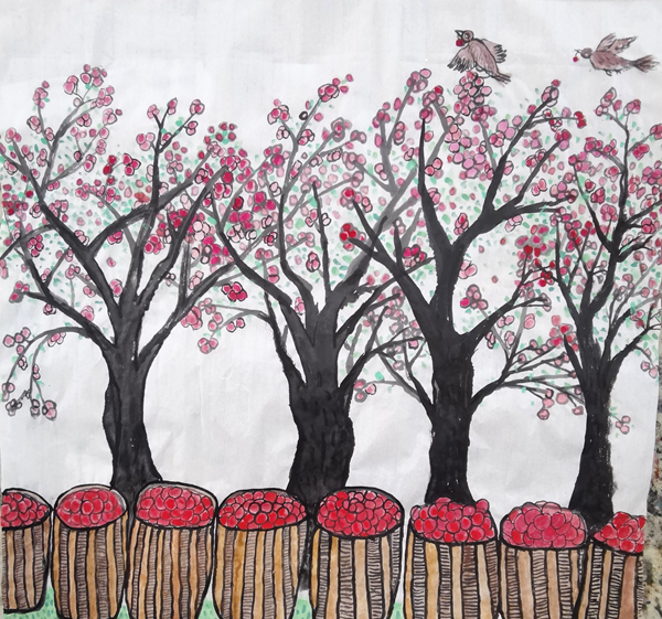 學(xué)校國(guó)畫(huà)社團(tuán)的孩子們,經(jīng)過(guò)兩天的緊張培訓(xùn)、繪制草圖、精心創(chuàng)作,十余名學(xué)生畫(huà)出了美麗鄉(xiāng)村的豐收?qǐng)鼍?,?huà)出了孩子們美好生活的快樂(lè)情趣,也畫(huà)出了漢調(diào)二黃戲劇人物水墨畫(huà)印象,從多角度贊美了美麗家園、幸福安康。在安康兒童美育專家宋安平和鄭字堂、王彬等老師的精心輔導(dǎo)下,孩子們的國(guó)畫(huà)作品,將選送參加中央美術(shù)學(xué)院少兒美術(shù)研究中心主辦的展覽。