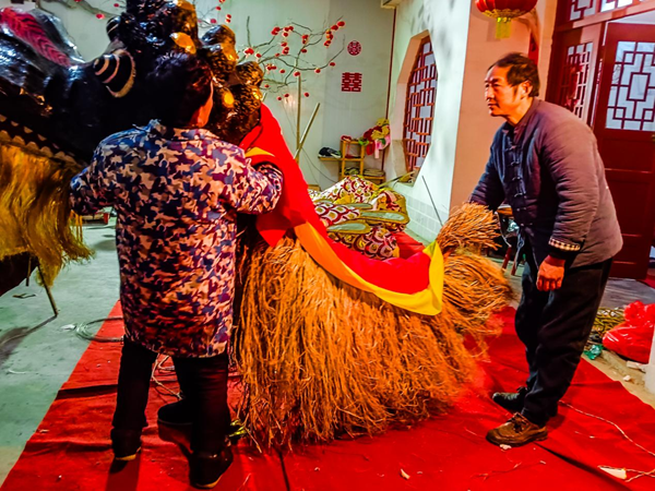 2月1日,大年初四,大家還沉浸在新年快樂中。喧天彩排鑼鼓一敲,嘹亮嗩吶一響,在雙河鎮(zhèn)政府的號(hào)召下,李忠寶帶著一群表演經(jīng)驗(yàn)豐富的文藝骨干、朝氣蓬勃的青年學(xué)生,換上演出行頭,帶著自制的花燈道具,開始李氏花燈游演排練。在現(xiàn)場(chǎng),彩色中國(guó)龍游動(dòng)、翻滾、盤踞,不停地變換著花樣;獅子騰躍、回旋、直立,時(shí)而威風(fēng)凜凜、時(shí)而憨態(tài)可掬……