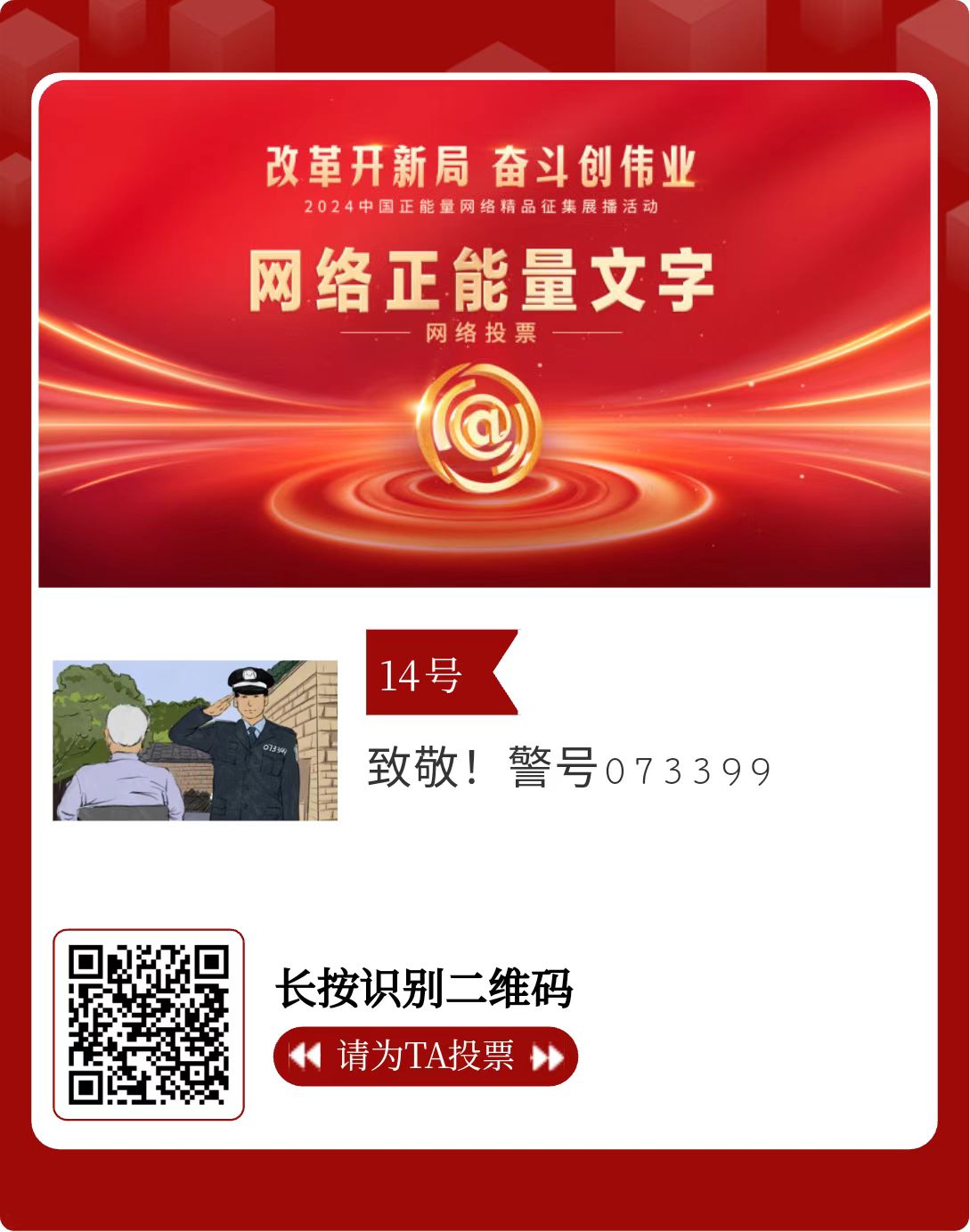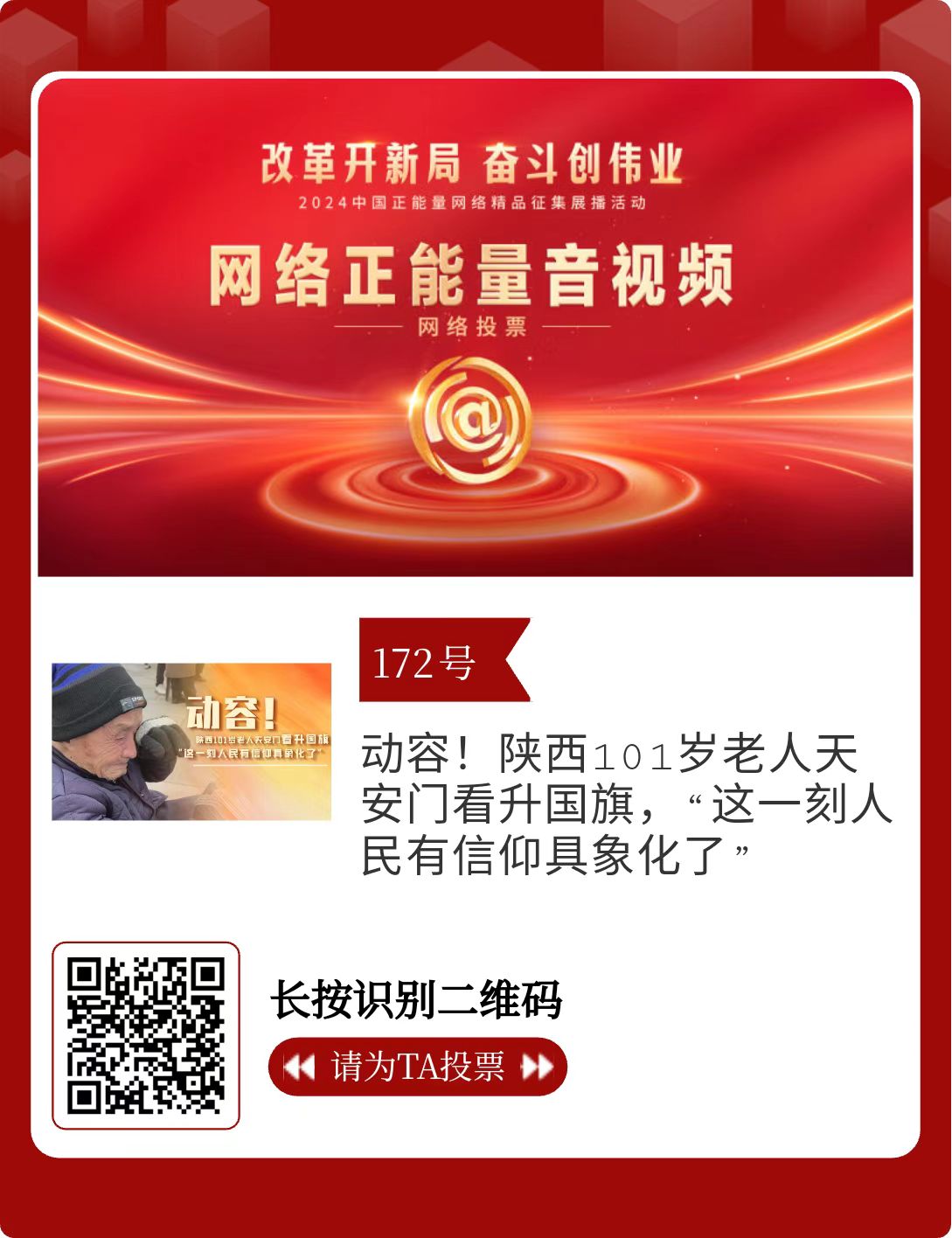 改革開新局,奮斗創(chuàng)偉業(yè)。由中央網(wǎng)信辦主辦的2024中國正能量網(wǎng)絡(luò)精品征集展播活動今天啟動網(wǎng)絡(luò)展播投票。