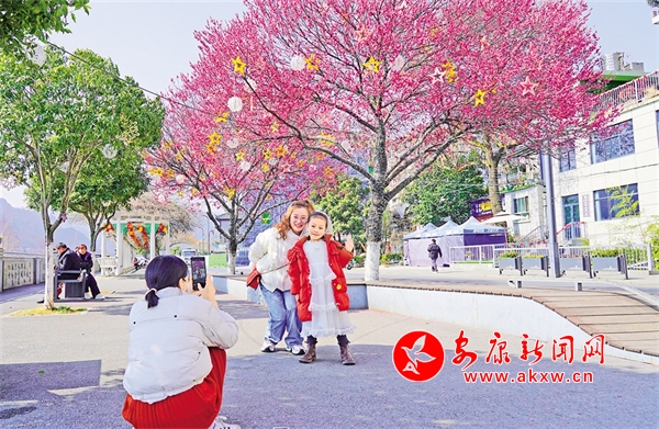 石泉縣濱江大道上紅梅競相綻放,廣大游客駐足觀看,打卡留念。譚文昌 攝?