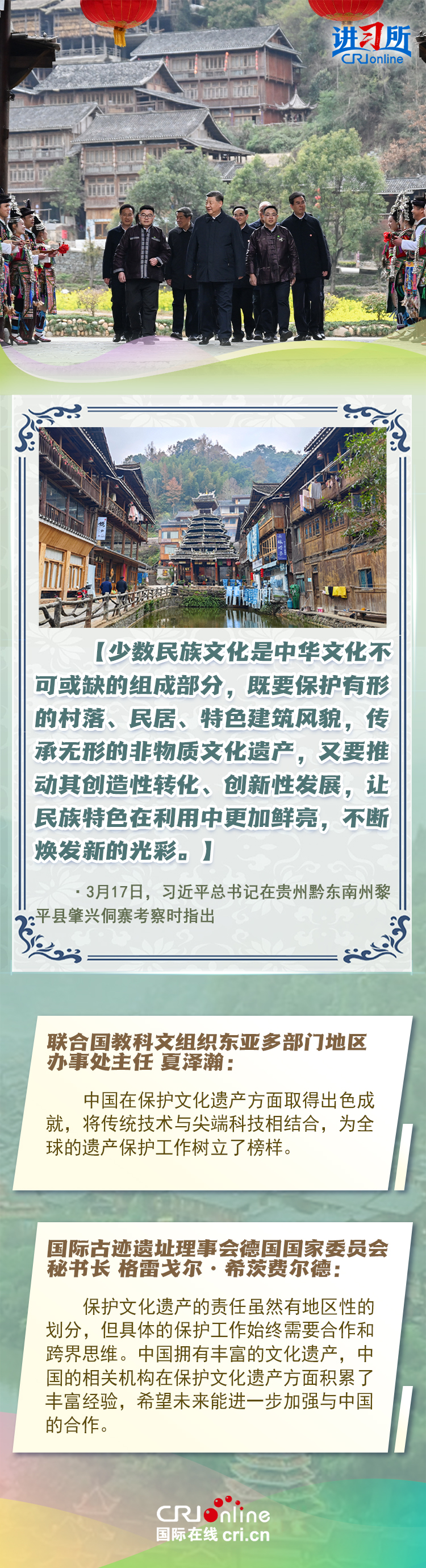 習近平總書記近日赴貴州、云南考察。他走進民族特色村寨、歷史文化古城,心系歷史文化遺產(chǎn)保護和文旅融合發(fā)展。習近平特別叮囑當?shù)毓賳T和群眾,既要保護有形的村落、民居、特色建筑風貌,傳承無形的非物質(zhì)文化遺產(chǎn),又要推動其創(chuàng)造性轉(zhuǎn)化、創(chuàng)新性發(fā)展。