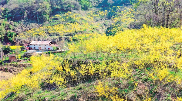 “目前,山上這一片連翹有600余畝,現(xiàn)在正值盛花期,除草工作刻不容緩?!眻@區(qū)管護負責人闞永軍指著漫山遍野的連翹花介紹。