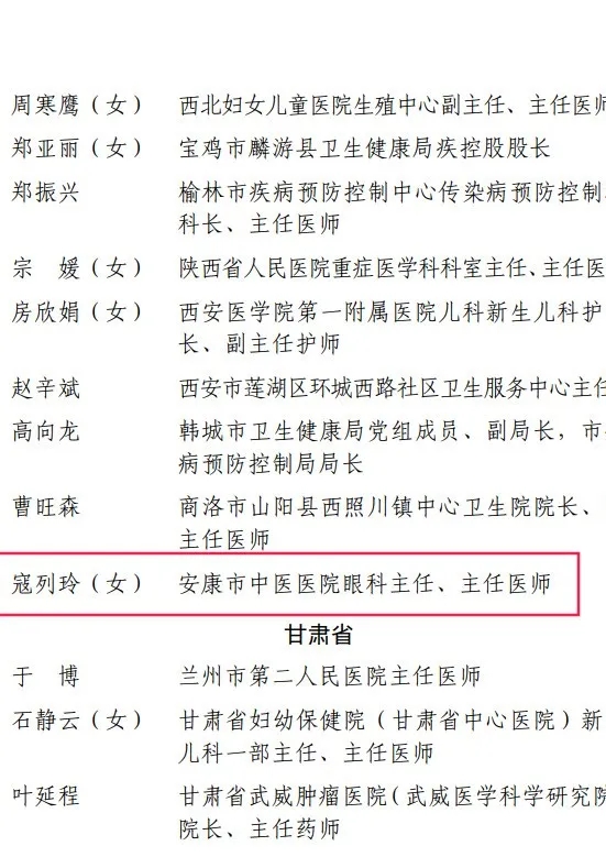 寇列玲,女,漢族,1975年10月生,陜西黃陵人,中共黨員,主任醫(yī)師,現(xiàn)任安康市中醫(yī)醫(yī)院眼科主任。該同志醫(yī)術(shù)精湛,服務(wù)患者耐心細(xì)致,心系社會(huì),開展近視防控公益行進(jìn)校園100余次,行程20萬公里,篩查學(xué)生10余萬人,受益學(xué)生50余萬人,解除安康山區(qū)數(shù)以萬計(jì)眼病患者痛苦,避免因盲致貧、因殘致貧。帶領(lǐng)眼科團(tuán)隊(duì)銳意進(jìn)取,眼科入選國家區(qū)域診療中心培育單位、國家中醫(yī)優(yōu)勢(shì)??平ㄔO(shè)項(xiàng)目、陜西省區(qū)域診療中心。參與國家中醫(yī)藥管理局《前部缺血性視神經(jīng)病變》臨床指南制修訂,完成省中醫(yī)藥管理局十大病種《玻璃體積血》《消渴目病》創(chuàng)新項(xiàng)目,取得陜西省科技成果三等獎(jiǎng)2項(xiàng),被評(píng)為安康市第四屆十佳醫(yī)生稱號(hào),榮獲安康市十佳科技青年獎(jiǎng),被評(píng)為安康市有突出貢獻(xiàn)專家,入選“西部之光”訪問學(xué)者。