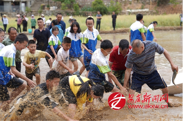 插秧比賽后緊接著開(kāi)展了拔河比賽,參賽者們光著腳在泥濘的田里奮力拉扯,你來(lái)我往,互不相讓,田邊的觀眾則奮力地為自己支持的隊(duì)伍加油鼓勁。稻田抓鴨捕魚活動(dòng)讓現(xiàn)場(chǎng)氣氛更加熱烈,觀眾紛紛脫下鞋襪,卷起褲腿,在稻田中追逐游魚和鴨子,歡快的笑聲此起彼伏。?
