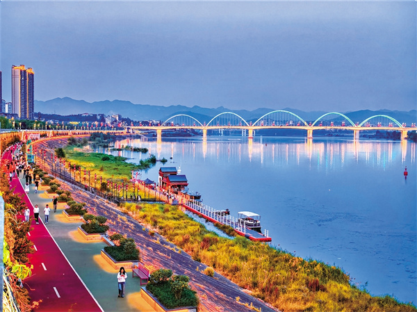 眼前的漢江是安康人的母親河,它發(fā)源于漢中市寧強(qiáng)縣,一路歡聲笑語,流過安康。旬陽電站建成蓄水后,這里變成安康湖,江面寬闊,碧波蕩漾。一艘漢江游船順流東下,幾艘快艇逆行沖浪。前方不遠(yuǎn)處那座彩虹橋下,一群孩子嘰嘰喳喳,正在那里學(xué)習(xí)游艇試水。漢江安康城區(qū)段過去只有一座大橋,后來先后修建了二橋、三橋、四橋。下游孩子們戲水的地方,就是東壩漢江大橋,也稱“四橋”。這座橋建得很漂亮,尤其是到了晚上,橋上的彩燈能夠變換出多種顏色,成為安康的“網(wǎng)紅橋”。