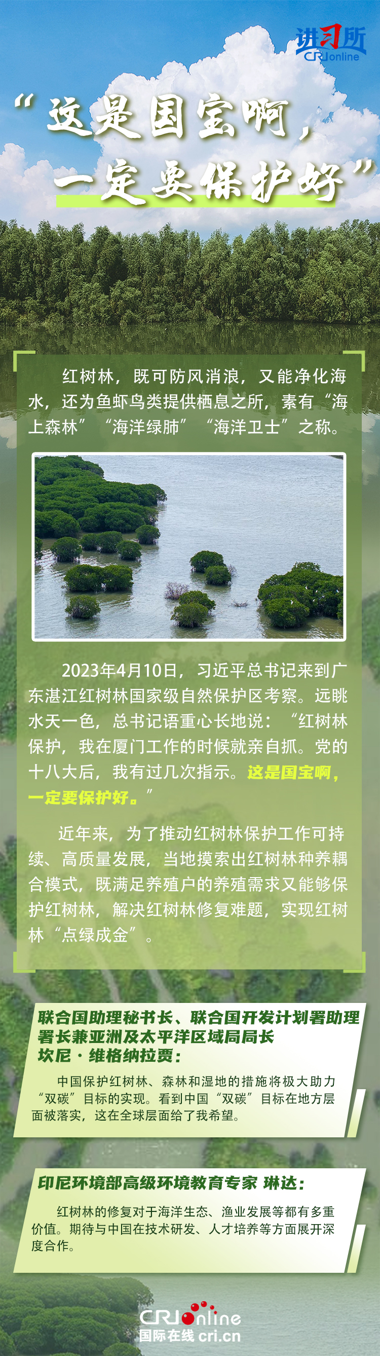 新時(shí)代以來(lái),在習(xí)近平生態(tài)文明思想的科學(xué)指引下,“兩山”理念已深入人心,從“點(diǎn)綠成金”的紅樹(shù)林到一座座“花果山”,再到走向世界的長(zhǎng)汀經(jīng)驗(yàn)……美麗中國(guó)建設(shè)邁出重大步伐,生態(tài)環(huán)境保護(hù)發(fā)生歷史性變化。國(guó)際社會(huì)認(rèn)為,中國(guó)取得廣泛的綠色發(fā)展成就,從根本上源于習(xí)近平生態(tài)文明思想,特別是“兩山”理念的指引。在通過(guò)綠色轉(zhuǎn)型推動(dòng)經(jīng)濟(jì)可持續(xù)發(fā)展方面,中國(guó)正成為全球可持續(xù)發(fā)展的典范。