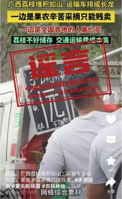 真相:6月12日,網(wǎng)傳“近日廣西荔枝堆積如山,運(yùn)輸車排成長龍。果農(nóng)辛苦采摘只能賤賣”的視頻,畫面顯示荔枝堆積和“靈山荔枝1元”字樣。經(jīng)核查,視頻內(nèi)容并非發(fā)生在靈山縣。目前,靈山荔枝“妃子笑”等中熟品種逐漸批量上市,大規(guī)模上市時(shí)間為6月20日左右,當(dāng)前荔枝產(chǎn)銷有序開展,并未發(fā)現(xiàn)個(gè)別媒體報(bào)道的“荔枝滯銷賤賣”“采摘堆積成山”“運(yùn)輸車排成長龍”的情況,也沒有發(fā)現(xiàn)價(jià)格低到1元的荔枝出售。(來源:“廣西互聯(lián)網(wǎng)違法和不良信息舉報(bào)”微信公眾號)