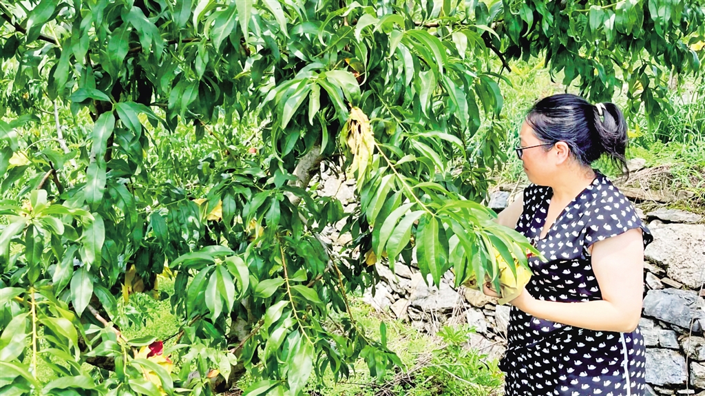 穿過(guò)村莊,山坡上500畝桃園綠意盎然。基地負(fù)責(zé)人伍娟與工人正采摘套袋?!?017年建設(shè)的桃園,今年雖受旱情影響,產(chǎn)量仍達(dá)30萬(wàn)斤,產(chǎn)值約300萬(wàn)元?!?o:p>