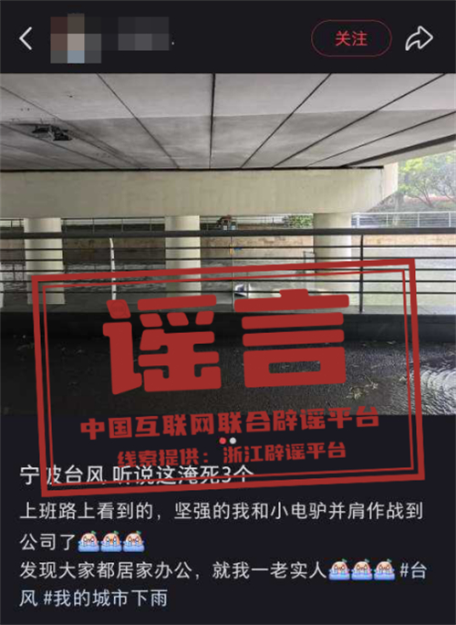 真相:7月30日9時(shí)許,某社交平臺網(wǎng)民沈某(女,23歲,寧波鄞州人)發(fā)帖造謠稱“寧波一涵洞內(nèi)車輛被淹,有3人淹死”。經(jīng)核查,該內(nèi)容系謠言,目前公安機(jī)關(guān)已對沈某依法予以批評教育,該帖文現(xiàn)已刪除。