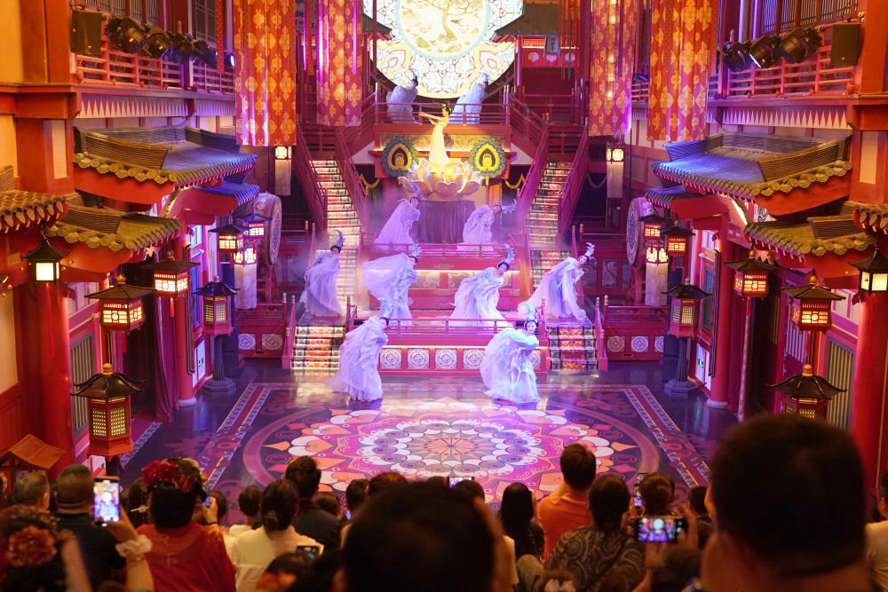 2024年5月19日,游客在西安長(zhǎng)安十二時(shí)辰景區(qū)觀看表演《霓裳羽衣舞》。“長(zhǎng)安十二時(shí)辰”主題街區(qū)將唐朝文化與現(xiàn)代旅游相結(jié)合,讓游客仿佛置身于千年前的長(zhǎng)安城。近年來(lái),西安積極推進(jìn)產(chǎn)業(yè)升級(jí)和文旅融合,以中華優(yōu)秀傳統(tǒng)文化創(chuàng)新創(chuàng)造活力助推經(jīng)濟(jì)社會(huì)高質(zhì)量發(fā)展,如大唐不夜城一樣火爆“出圈”的文旅項(xiàng)目層出不窮。