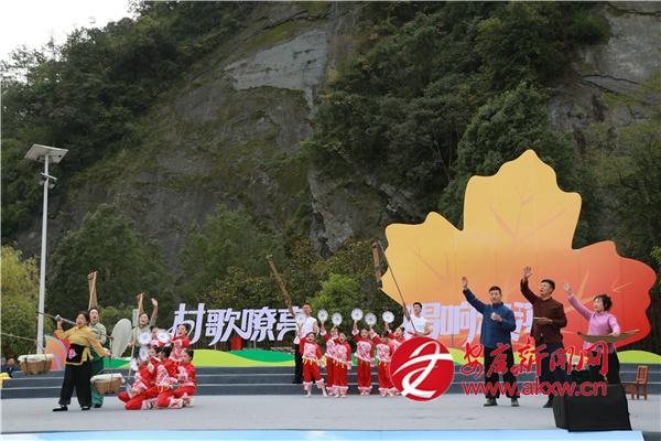 金秋時(shí)節(jié)的茨溝鎮(zhèn),萬畝紅葉、層林盡染。伴隨著歡快的鑼鼓聲,茨溝鎮(zhèn)、五里鎮(zhèn)、譚壩鎮(zhèn)三支隊(duì)伍輪番登場(chǎng),不僅獻(xiàn)唱原創(chuàng)村歌,還展示特色產(chǎn)業(yè)、優(yōu)質(zhì)資源與地方文化,紛紛亮出獨(dú)具特色的“看家絕活兒”。歌伴舞《村歌飛揚(yáng)》《松壩謠》《幸福歌兒唱起來》唱出了鄉(xiāng)親們的幸福生活;以修建八一水庫為背景的安康歌謠《我來了》引發(fā)會(huì)場(chǎng)共鳴;民俗表演《龍的傳人》則將節(jié)目推向高潮。舞蹈、鄉(xiāng)村T臺(tái)秀、民俗表演、八岔戲等節(jié)目,或以傳統(tǒng)幽默詼諧的風(fēng)格,或以深情敘述的方式,展現(xiàn)鄉(xiāng)村新生活,為觀眾獻(xiàn)上一場(chǎng)別開生面的視聽盛宴,現(xiàn)場(chǎng)歡呼聲此起彼伏。