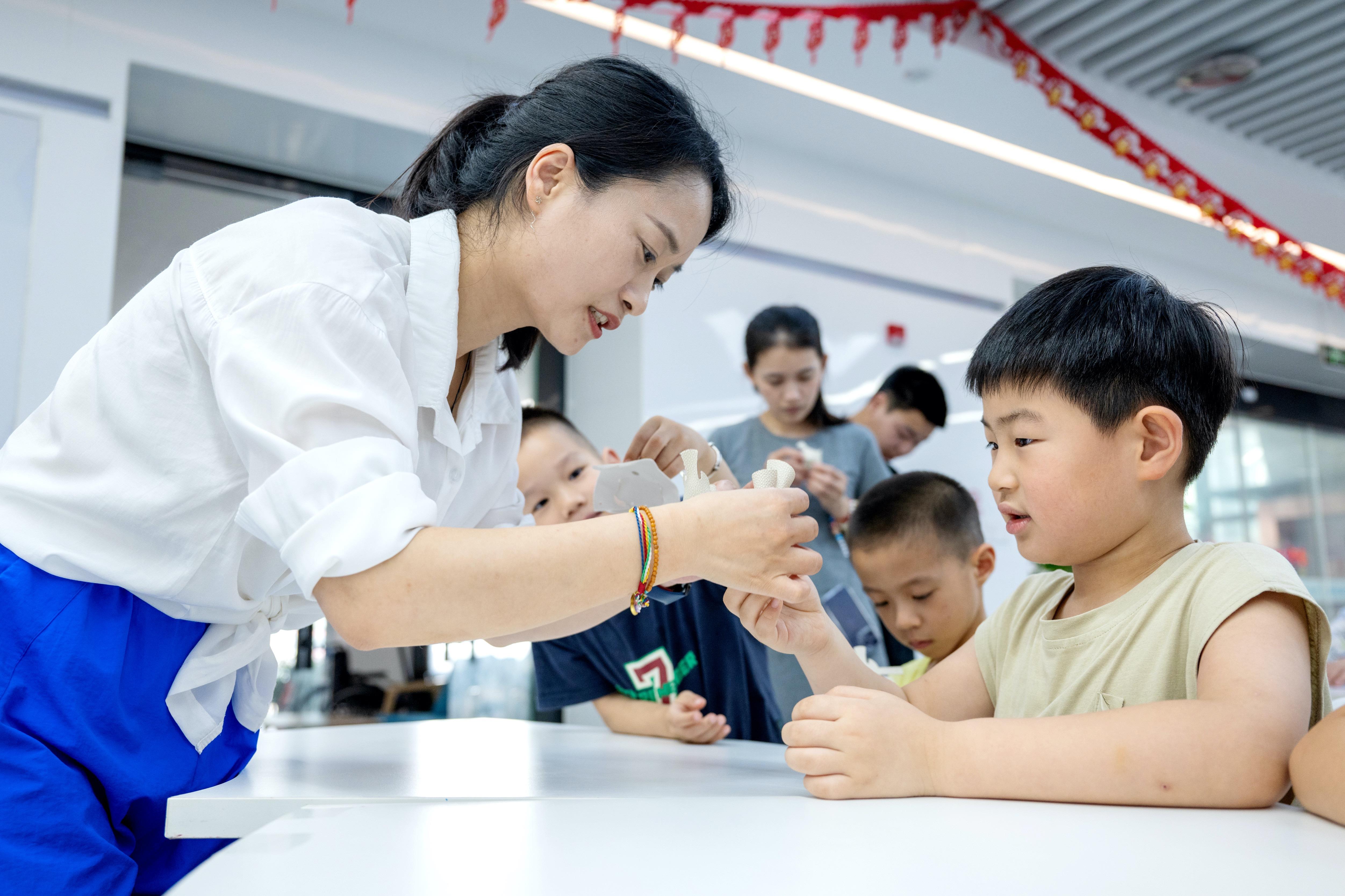 △2025年7月3日,浙江湖州長興縣龍山街道齊北社區(qū)幸福鄰里中心,志愿者指導(dǎo)孩子們制作手工。