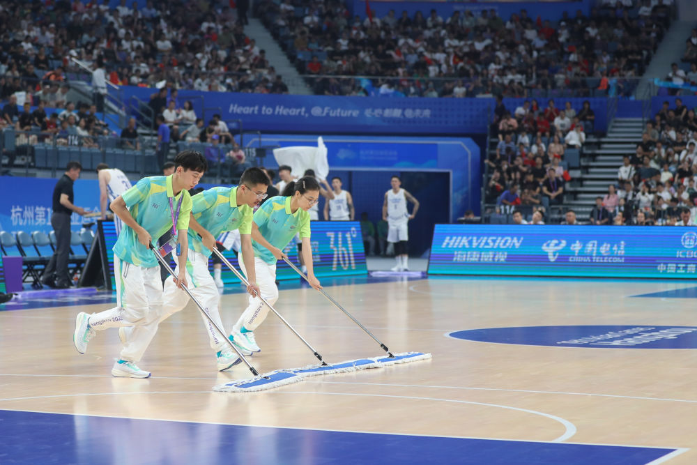 ??2023年9月28日,杭州亞運(yùn)會(huì)志愿者“小青荷”在杭州亞運(yùn)會(huì)籃球男子預(yù)賽B組比賽前清潔場(chǎng)地。從2016年二十國(guó)集團(tuán)領(lǐng)導(dǎo)人杭州峰會(huì)以來(lái),“小青荷”這一志愿服務(wù)工作品牌已成為杭州大型賽會(huì)服務(wù)的一張金名片。