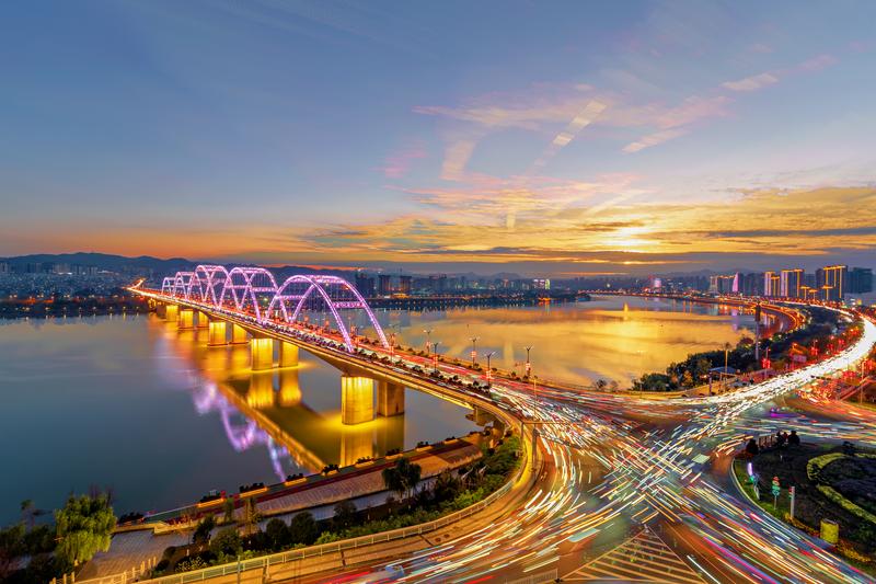 夕陽(yáng)下的東壩漢江大橋流光溢彩。近年來(lái),我市不斷優(yōu)化城市路網(wǎng),市民出行更加便捷,城市交通更加順暢。 皮勇維 攝