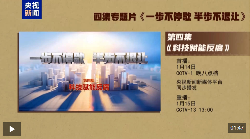電視專題片《一步不停歇 半步不退讓》第四集《科技賦能反腐》,講述紀(jì)檢監(jiān)察機關(guān)豐富防治新型腐敗和隱性腐敗有效辦法,以信息化賦能正風(fēng)反腐,充分運用科技手段精準(zhǔn)發(fā)現(xiàn)不正之風(fēng)和腐敗問題線索、迅速有效突破案件,著力提升智慧反腐、科技反腐水平。總臺央視綜合頻道1月14日晚8點檔播出,央視新聞新媒體平臺同步播發(fā)。