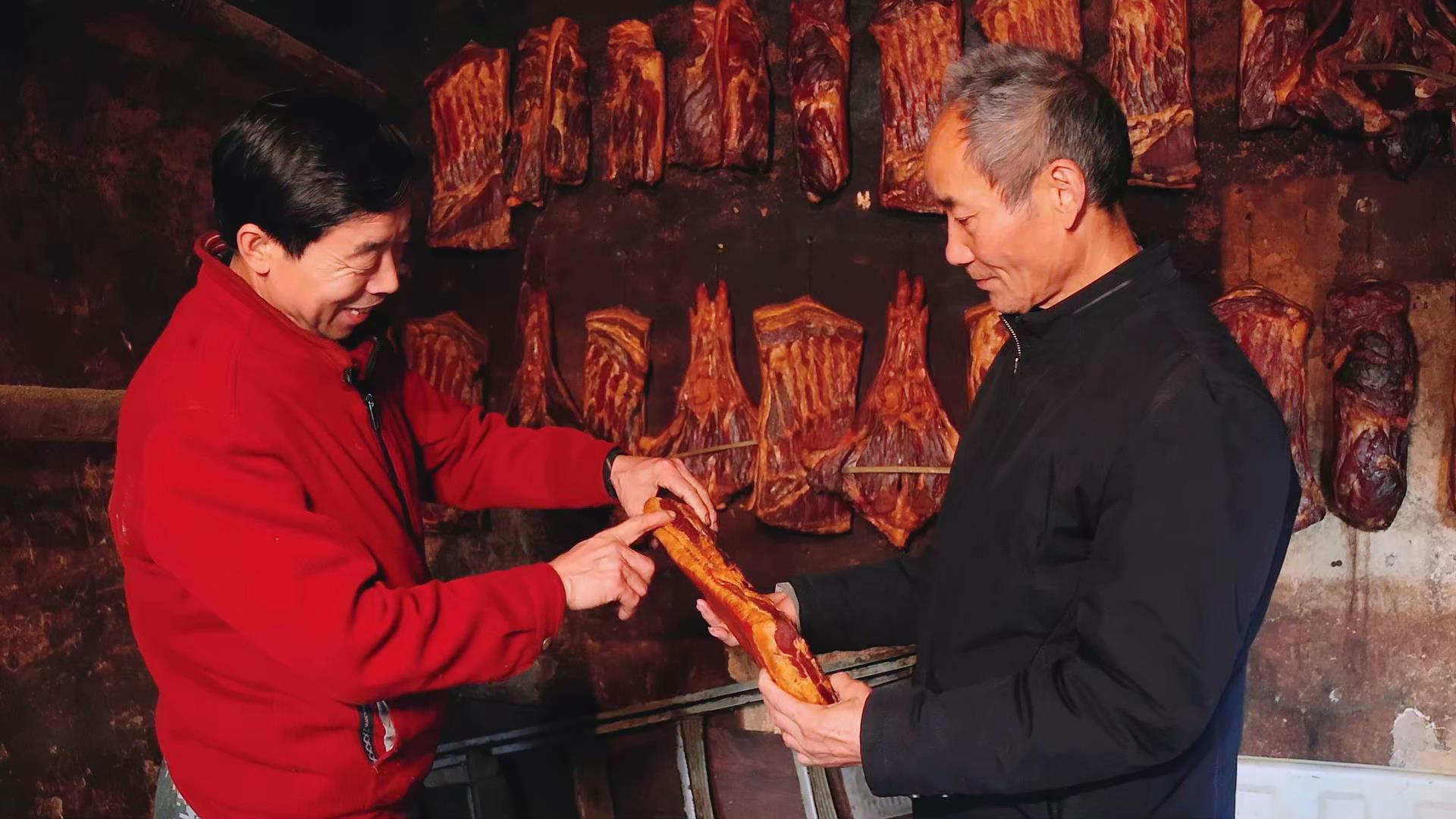 石泉縣城關(guān)鎮(zhèn)珍珠河村村民王全勇(左)熏制臘肉已有十來年,是當(dāng)?shù)赜忻呐D味制作能手。今年,他熏制的上萬(wàn)斤臘肉和香腸早早就被預(yù)訂,有的還通過網(wǎng)絡(luò)被賣到北京、山東等省市。 郭依萍 攝