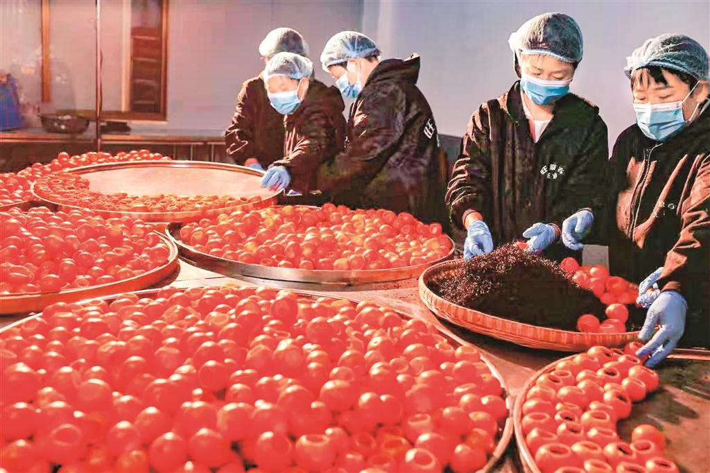 生產(chǎn)車間內(nèi),工人們動(dòng)作嫻熟,選果、清洗、開蓋、掏挖果肉、填茶、烘干……每一道工序都有條不紊。他們大都是附近的村民,本是茶葉生產(chǎn)的淡季,如今卻因?yàn)樾¢俨枳兂闪嗽鍪盏耐尽?/p>