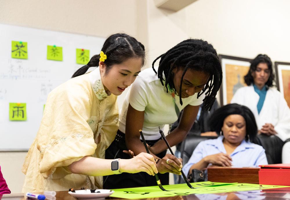 △2025年4月17日,在南非約翰內(nèi)斯堡,學(xué)生與孔子學(xué)院志愿者在“國(guó)際中文日”活動(dòng)上寫毛筆字。