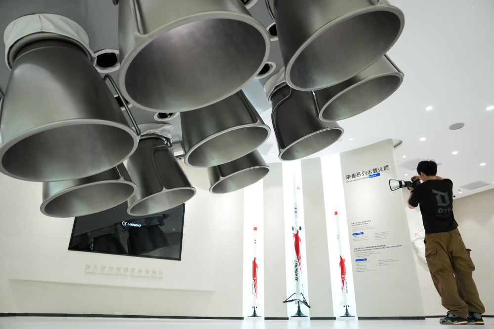 強(qiáng)化產(chǎn)業(yè)圈聯(lián)動(dòng)發(fā)展,是北京持續(xù)提升科技成果區(qū)域內(nèi)轉(zhuǎn)化效率和比重的有效舉措。以商業(yè)航天產(chǎn)業(yè)為例,目前,扎根北京的商業(yè)航天百?gòu)?qiáng)企業(yè)、上市企業(yè)和獨(dú)角獸企業(yè)約占全國(guó)半壁江山。產(chǎn)業(yè)鏈覆蓋運(yùn)載火箭、衛(wèi)星制造、地面站及終端設(shè)備、衛(wèi)星應(yīng)用服務(wù)全領(lǐng)域。這是2025年6月18日在北京經(jīng)濟(jì)技術(shù)開(kāi)發(fā)區(qū)藍(lán)箭航天空間科技股份有限公司拍攝的朱雀系列運(yùn)載火箭模型。