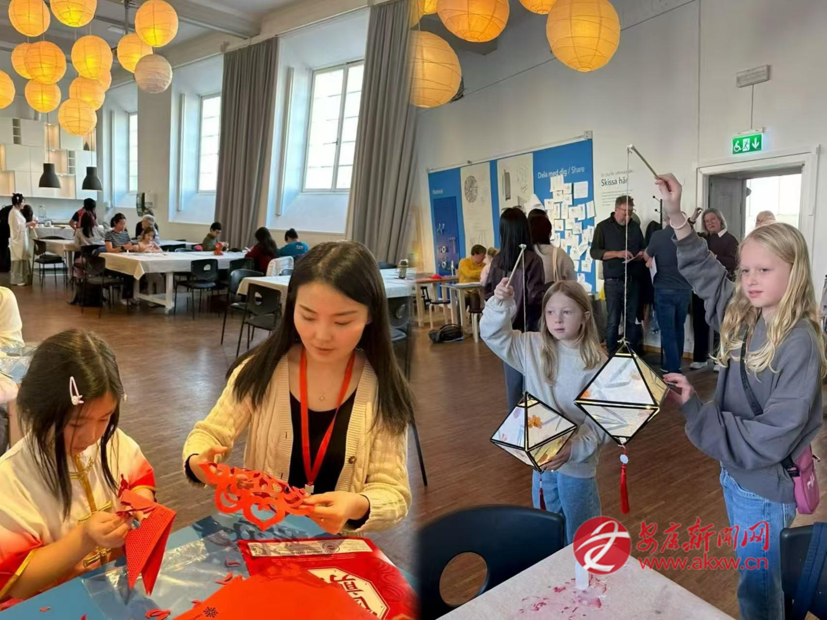 2025年中秋節(jié),邱萌受邀參加哥德堡總領館舉辦的文化活動,在哥德堡市立博物館的展廳里,她教當?shù)睾⒆觽冏鰺艋\、剪剪紙。邱萌和孩子們一起用宣紙折疊成燈籠,讓瑞典人得以近距離觸摸中國節(jié)日。有人好奇地問起中秋的月亮,她便講起嫦娥奔月的傳說,講起月餅的寓意,講起“千里共嬋娟”的詩句。博物館里點亮了許多盞燈籠,每一盞都映照著孩子們專注而好奇的臉龐。