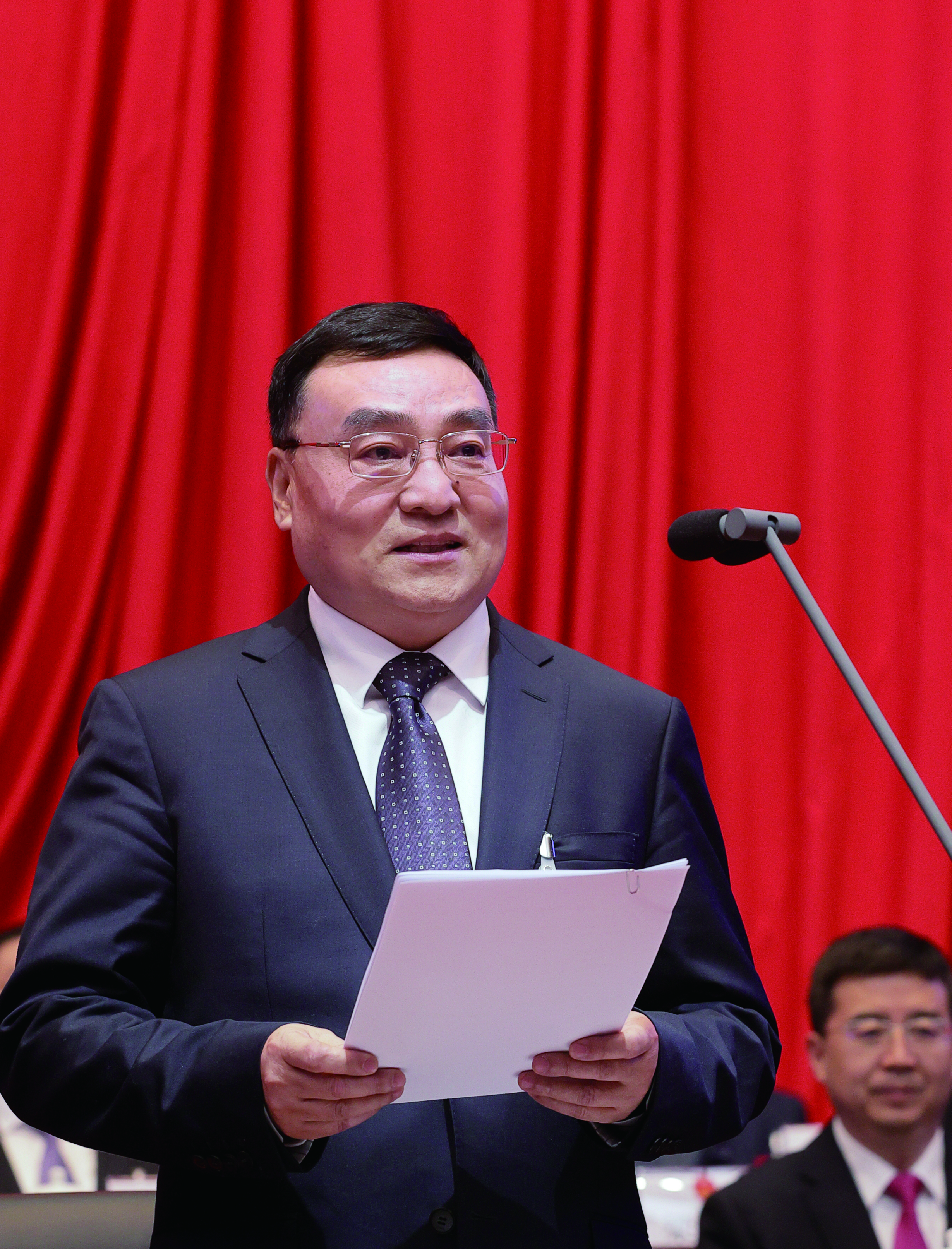 會(huì)場(chǎng)氣氛莊重而熱烈,主席臺(tái)帷幕正中高懸的國(guó)徽在鮮艷的紅旗映襯下熠熠生輝。主席臺(tái)對(duì)面懸掛“牢記囑托、勇?lián)姑?、開拓創(chuàng)新、拼搏奮進(jìn),為在中國(guó)式現(xiàn)代化道路上聚力建設(shè)幸福安康不懈奮斗!”的橫幅,鼓舞人心、催人奮進(jìn)。