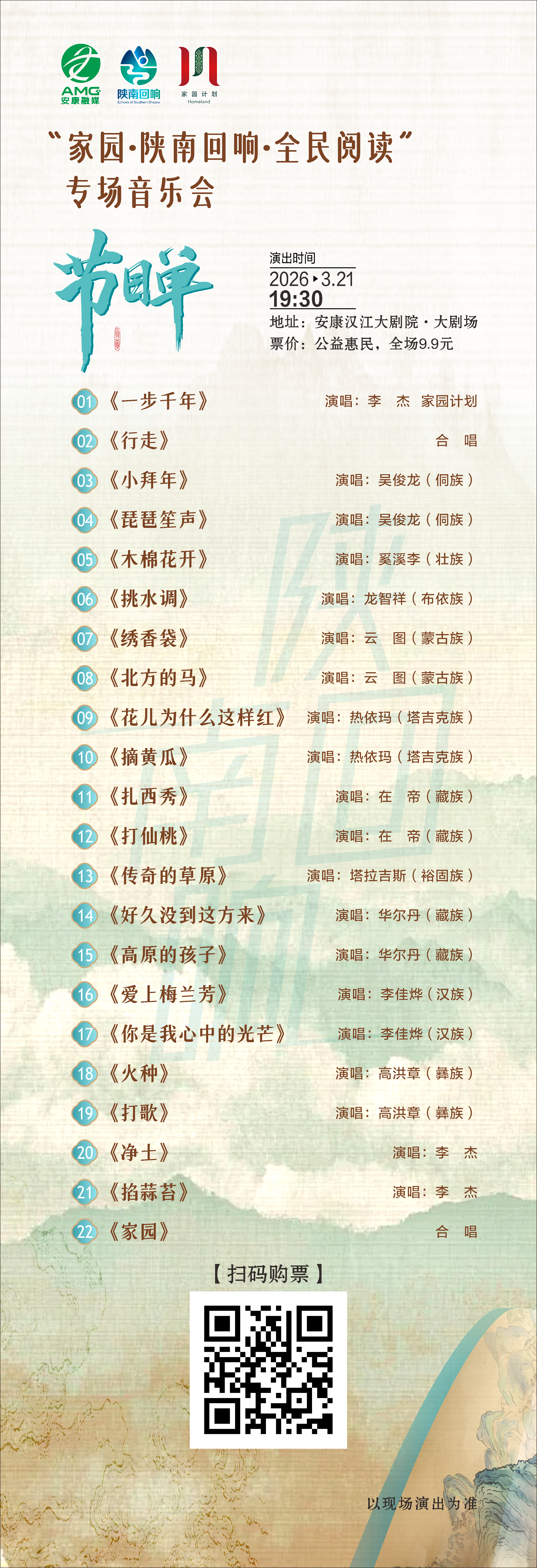 今年2月1日,《全民閱讀促進(jìn)條例》正式施行,標(biāo)志著全民閱讀邁入法治化、規(guī)范化的發(fā)展新階段。條例明確指出,要鼓勵開展內(nèi)容健康、展現(xiàn)文化底蘊(yùn)、形式多樣的閱讀推廣活動。在安康,閱讀不僅是靜默的文字,更可以是躍動的音符、流淌的旋律。3月21日(周六)19:30,一場別開生面的“家園·陜南回響·全民閱讀”專場音樂會將在安康漢江大劇院大劇場拉開帷幕。這場由著名音樂人李杰領(lǐng)銜、匯聚九大民族藝術(shù)家的視聽盛宴,邀您共赴一場“用歌聲閱讀大地”的詩意之約。