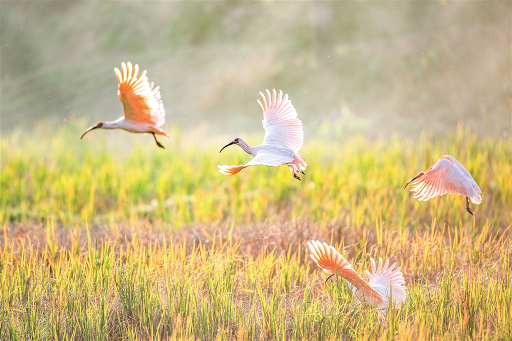 朱鹮長什么樣呢?如果你看到一只鳥,長著紅紅的臉、長長的嘴,還有一雙大長腿,總是梳著帥氣的“大背頭”,在河流、水田里悠閑地走來走去——恭喜你,它就是國寶朱鹮!朱鹮體長67厘米到79厘米,身材修長,氣質(zhì)優(yōu)雅,膽子有點小,喜歡安靜。它們常常成對或組成小群活動,飛行的時候脖子伸得長長的,雙腿收在身后,姿態(tài)特別優(yōu)美。朱鹮的羽毛顏色還會隨著季節(jié)變化:春夏季,其脖子和背部羽毛呈鉛灰色;到了秋冬季,全身羽毛變成以白色為主,翅膀和羽毛根部還會染上淡淡的粉紅色,就像穿上了漸變色的裙子,美極了!