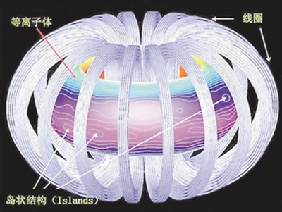 核聚變的燃料是氘和氚,在自然界的存量近于無限。聚變產(chǎn)生巨量能源時幾乎不會有污染物,也無放射性核廢料,是目前已知的可最終解決人類能源和環(huán)境問題的最重要的途徑之一。上世紀30年代,核聚變的原理就被提出來,但是產(chǎn)生可控核聚變需要的條件非?量獭N覀冎,太陽中心溫度可達1500萬攝氏度,再加上巨大的壓力,使核聚變能夠進行。地球上,人類所能獲得的壓力條件有限,只能通過將溫度提高至上億度來彌補。而如此高的溫度沒有任何一種固體物質能承受,只能靠強大的磁場來約束,由此產(chǎn)生了磁約束核聚變。而產(chǎn)生強大磁場,進行磁約束核聚變的反應設備就是托卡馬克裝置(Tokamak)。其中央是一個環(huán)形的真空室,外面纏繞著線圈。在通電的時候,托卡馬克裝置的內部會產(chǎn)生巨大的螺旋型磁場,將其中的等離子體加熱到很高的溫度,以達到核聚變的目的。第一代托卡馬克裝置由蘇聯(lián)科學家阿齊莫維齊等人在20世紀50年代發(fā)明。