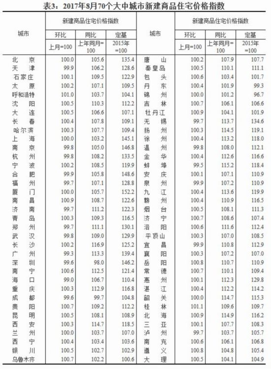 2017年8月70個(gè)大中城市新建商品住宅價(jià)格指數(shù)。來源:國(guó)家統(tǒng)計(jì)局