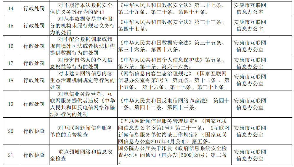 安康市互聯(lián)網(wǎng)信息辦公室行政執(zhí)法事項(xiàng)目錄清單