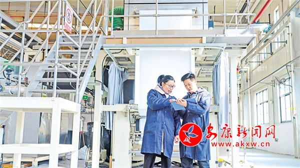 陜西鼎澈膜科技有限公司車間內(nèi),工作人員在核對(duì)生產(chǎn)數(shù)據(jù)。DQT安康新聞網(wǎng)